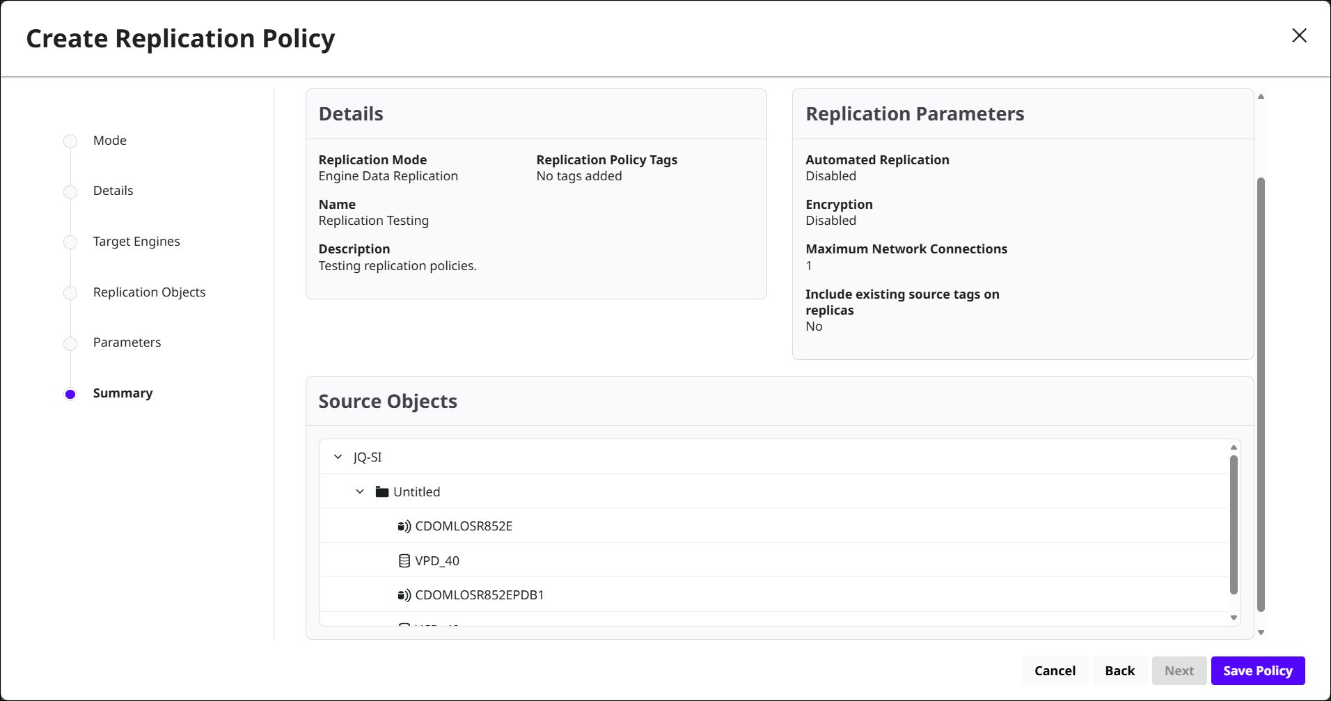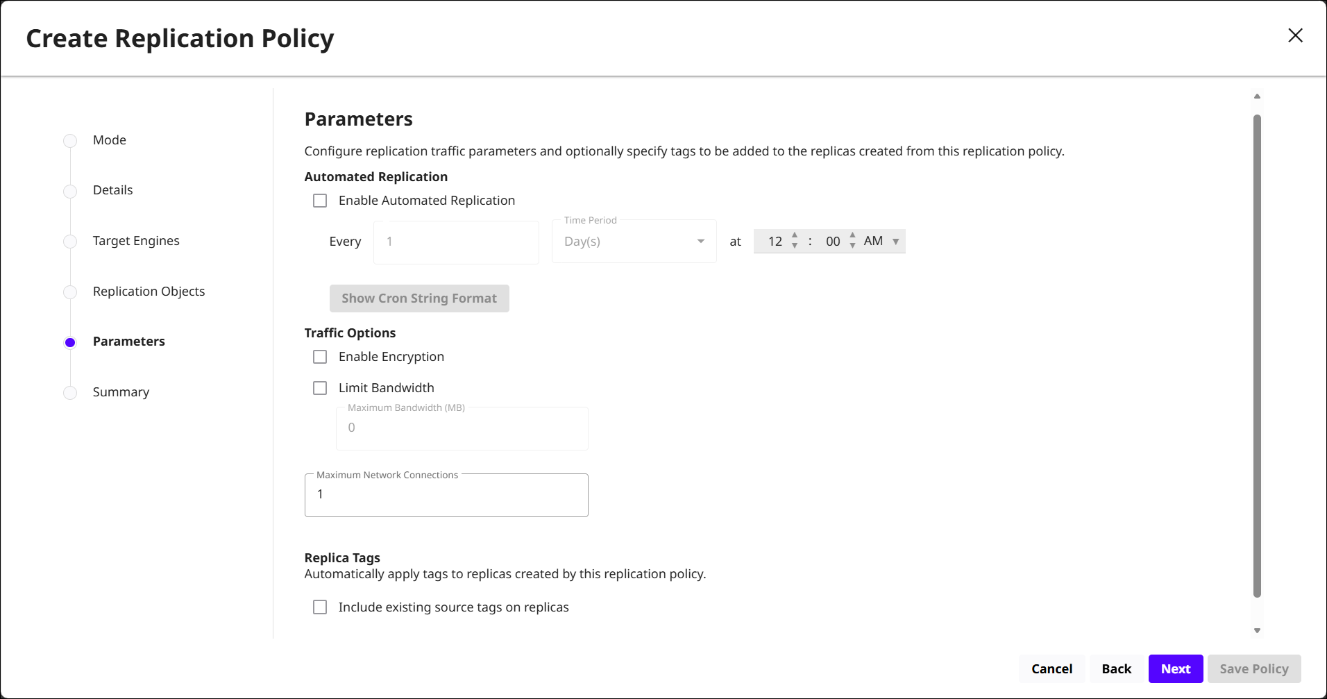 To create a Replication Policy in DCT, click the + Replication Policy button at the top of the main Replication page. You will need to configure each of the following sections.