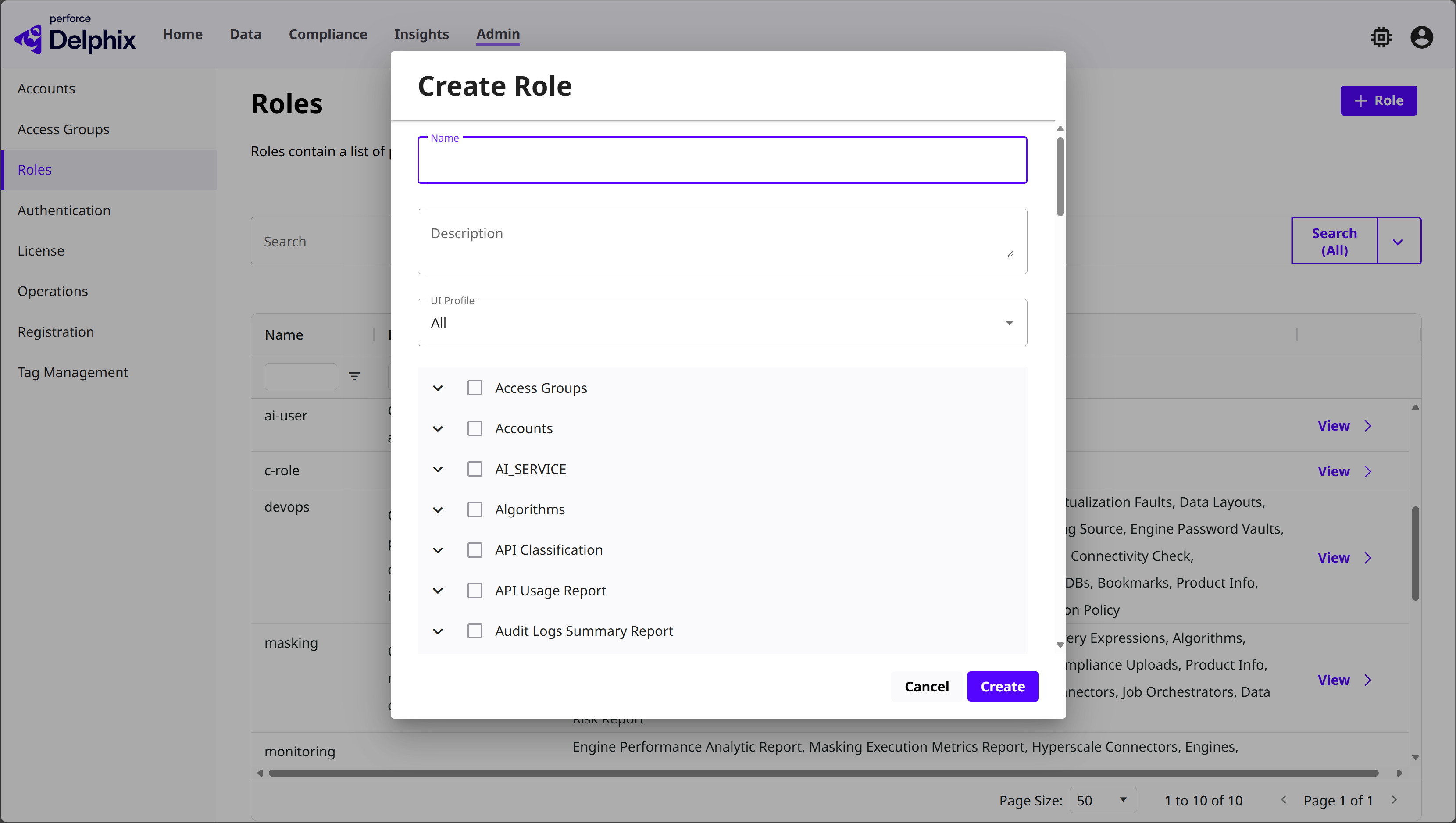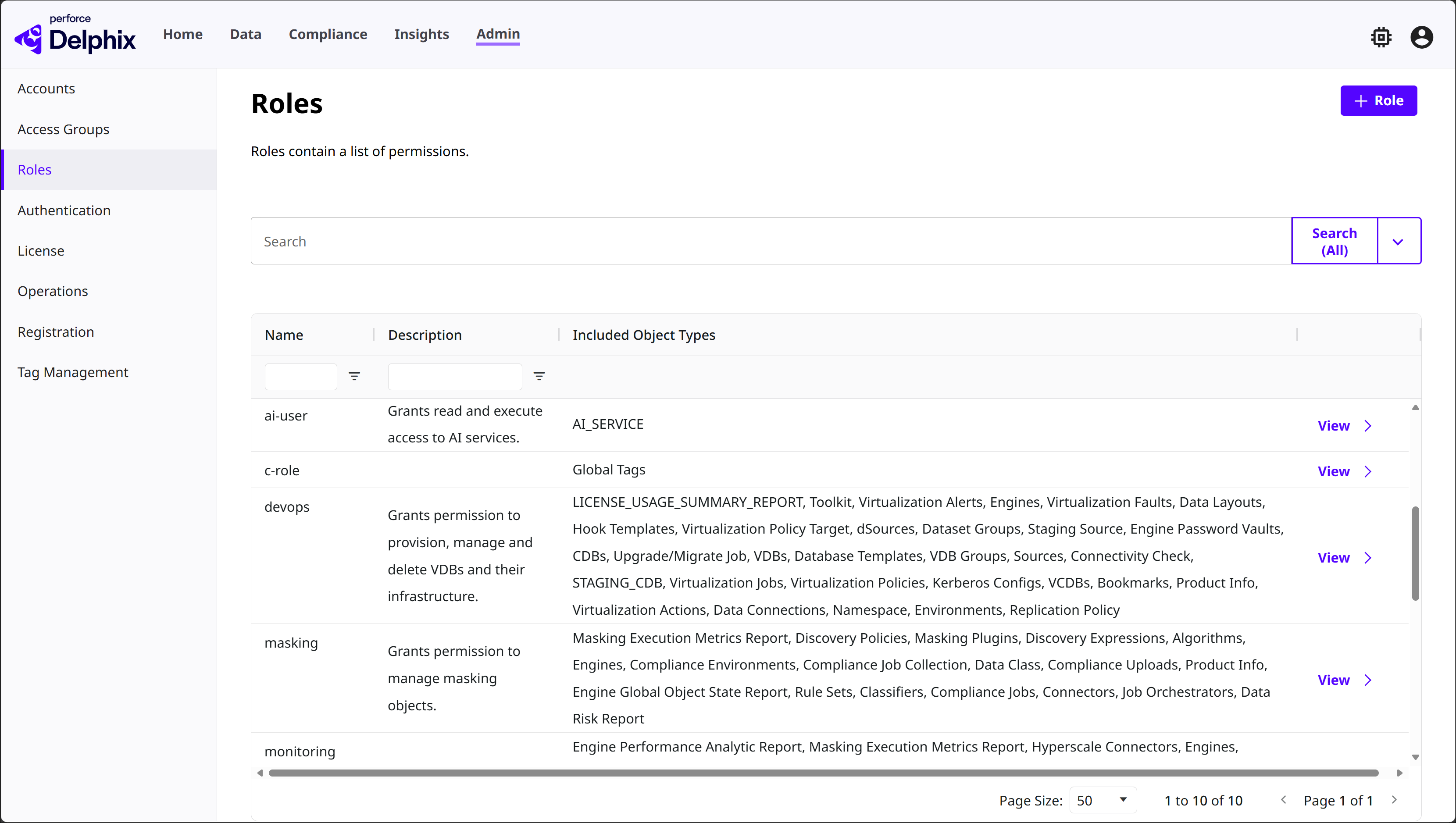 Navigate to the Admin > Roles tab to see a list of DCT’s default roles. Each role has its selection of permissions, such as Read VDB, Delete Bookmarks, Modify dSources, etc. Select View on any role to see its permissions.
