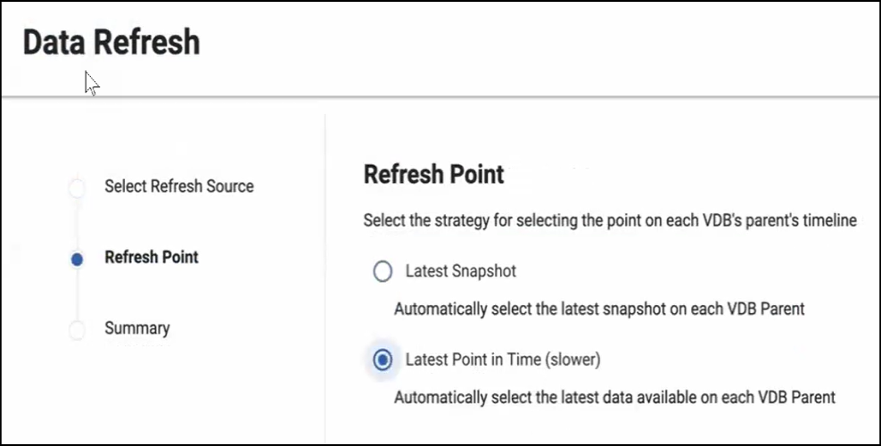 This feature introduces the option to refresh from the Latest Point in Time for VDB Groups, in addition to the default Latest Snapshot option. Users can review the latest point-in-time details for each VDB on the Summary page.