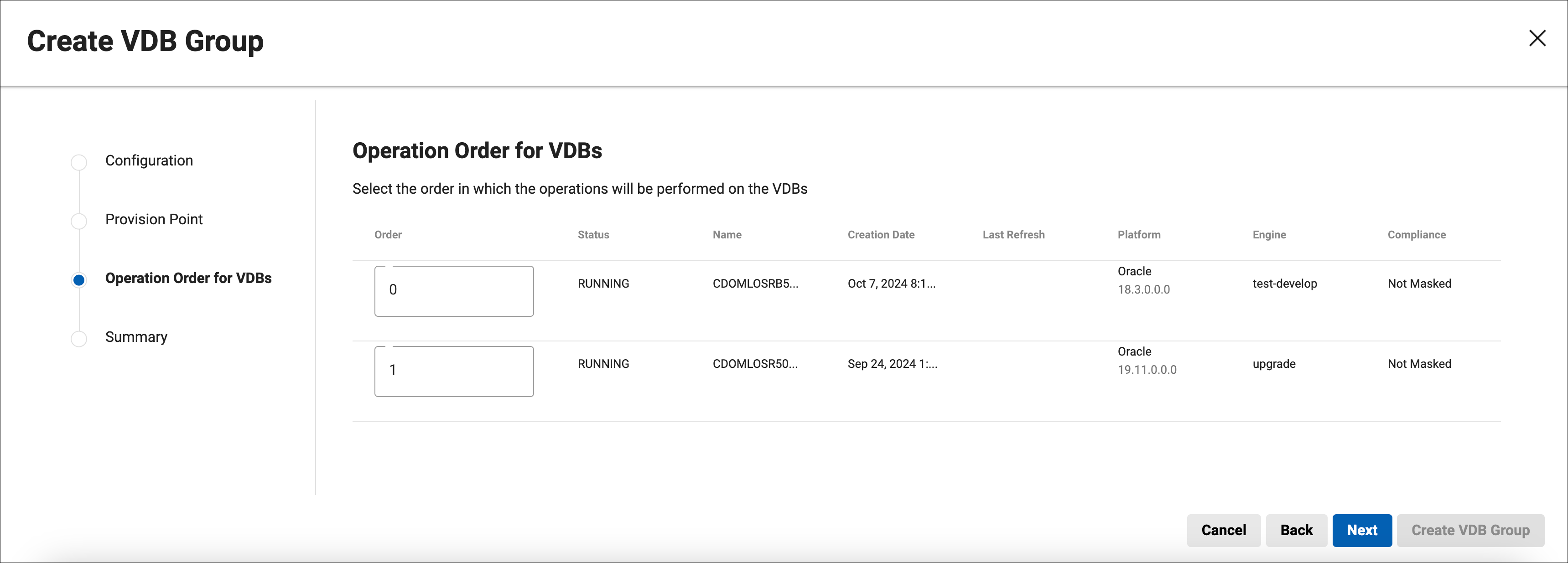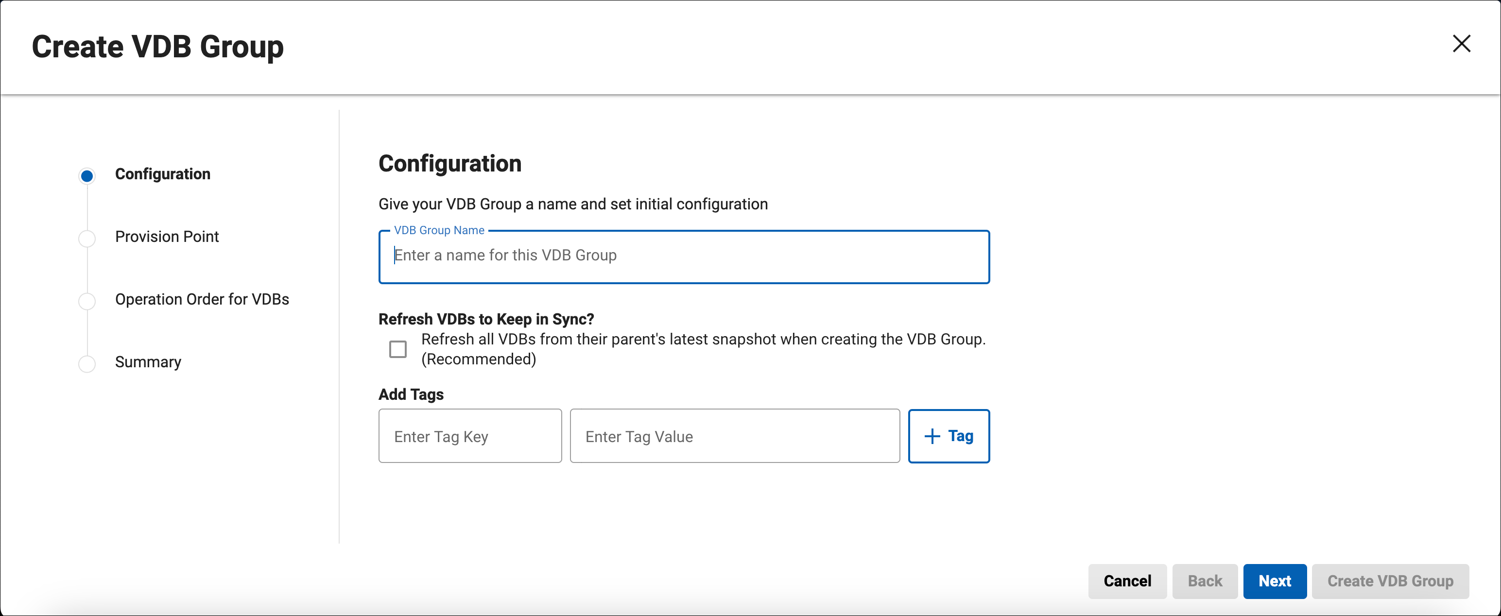 The creation of a VDB Group is facilitated through a three-step wizard: