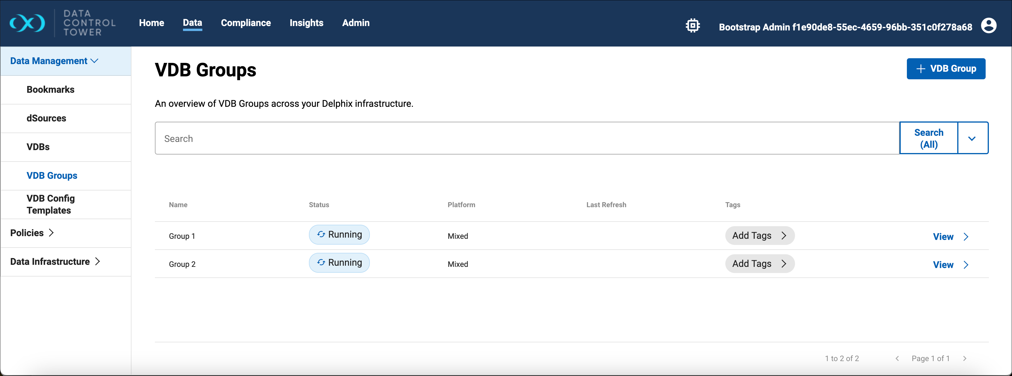 Once created, VDB Groups are displayed in a list with several columns of information: Name, Status, Platform, Last Refresh, Tags