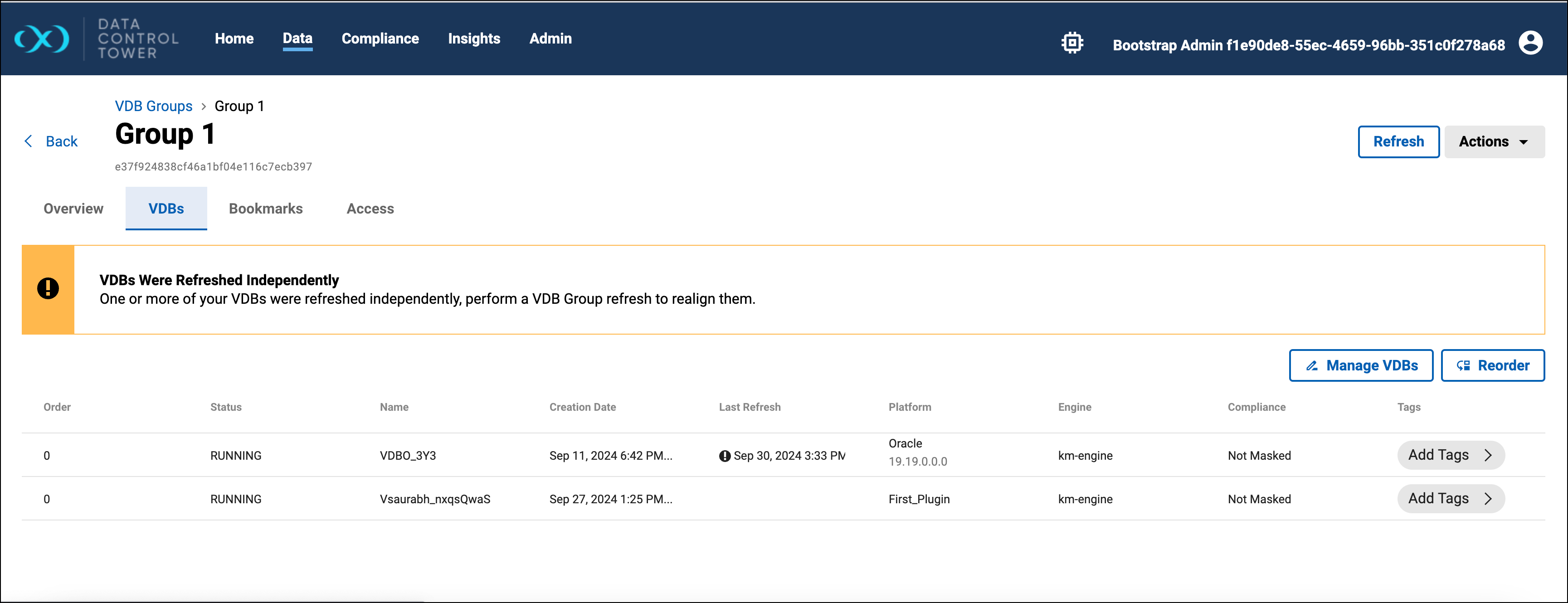 DCT can add/remove VDBs to/from the group and arrange the order from which bulk operations (like refresh) will be applied. This is particularly crucial for data sources like Oracle EBS, where application files and the underlying Oracle database need to be refreshed in a specific order. -