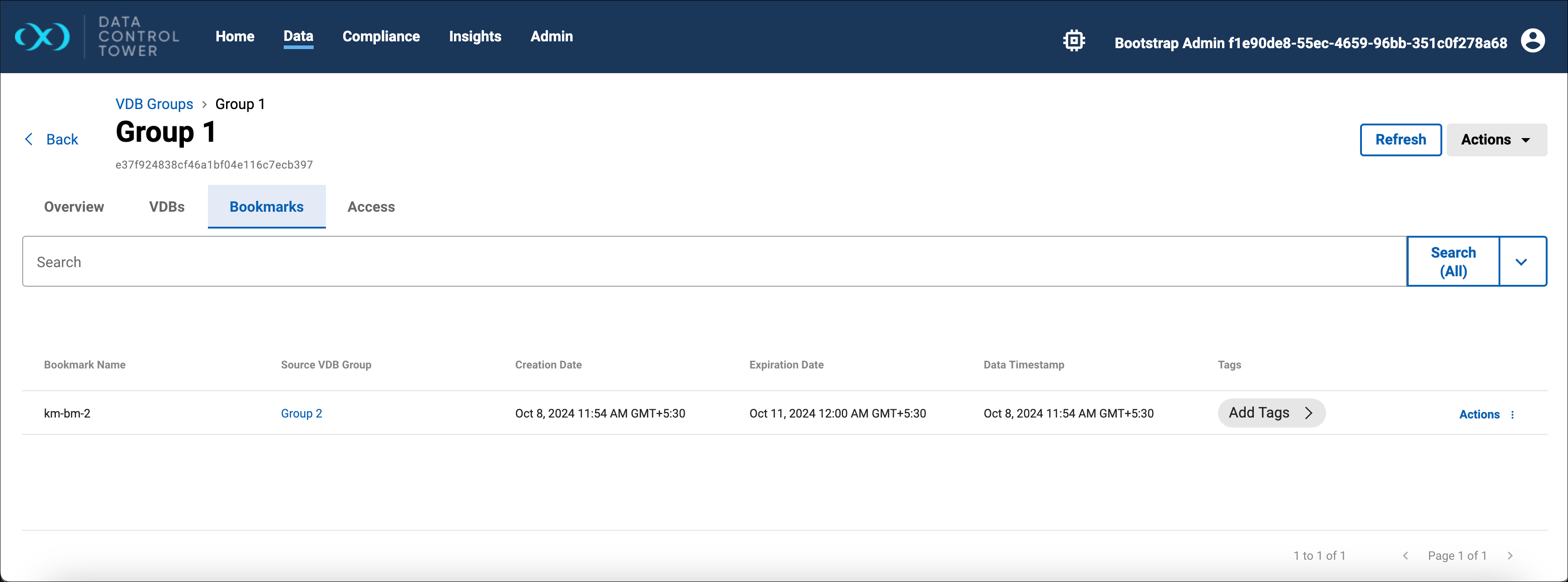 Create Bookmark: Creates a bookmark on the VDB Group.