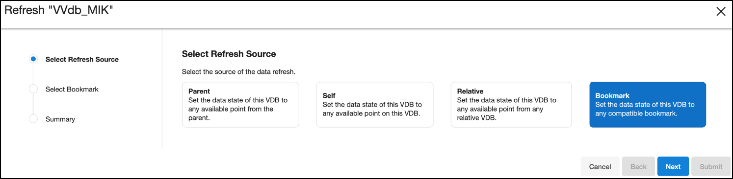 Refresh to Bookmark: Select a compatible bookmark from the VDB.