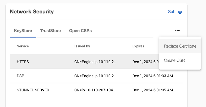 From the Network Security panel, select the Actions (...) menu, and select Replace Certificate.