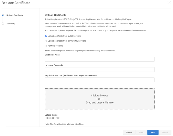 This section describes the steps to take if you are replacing the HTTPS or DSP (Delphix Session Protocol) or stunnel-server with your own key pair and certificate. To start, you need to add the key pair and full certificate chain as an entry in a file in JKS or PKCS #12 format.