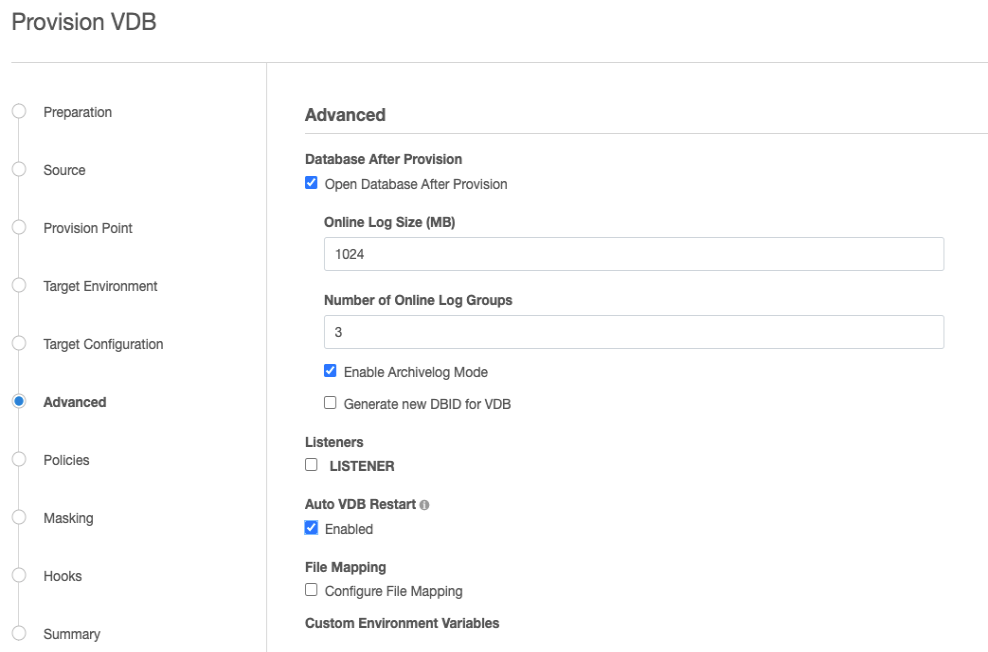 In the VDB provisioning process, it may be necessary to create mappings between files and directories that exist on the source, and files or file directories that exist on the target. An example of this is creating a copy in the target environment of a wallet file for an encrypted database that exists in the source environment.