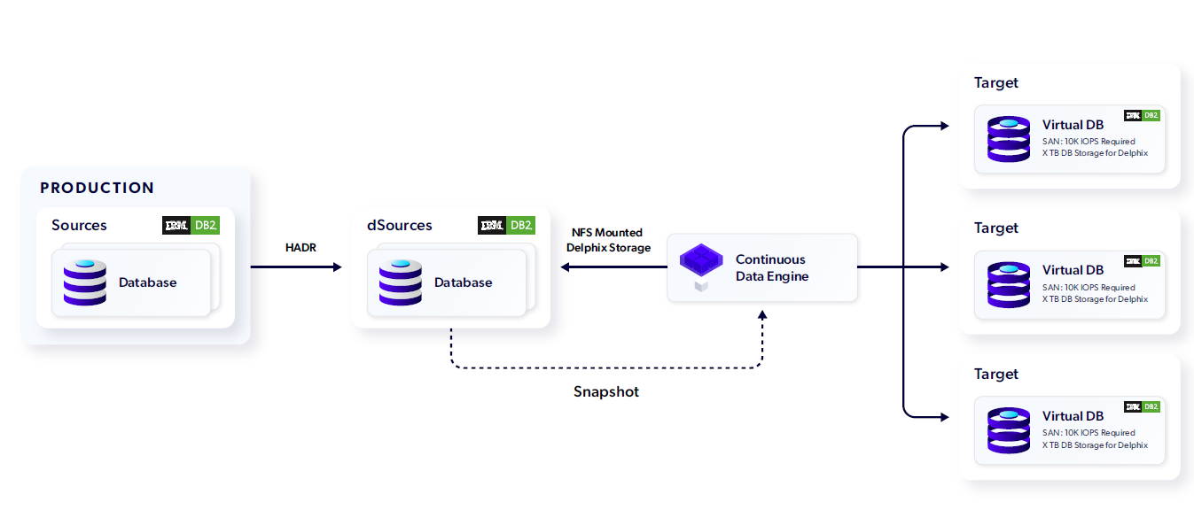 The following diagram demonstrates the architecture of the Delphix Continuous Data Engine support for the IBM Db2 database with HADR between the source and staging database. HADR ingestion type is supported only with non-partitioned databases and the terms staging and standby can be used interchangeably in this context.