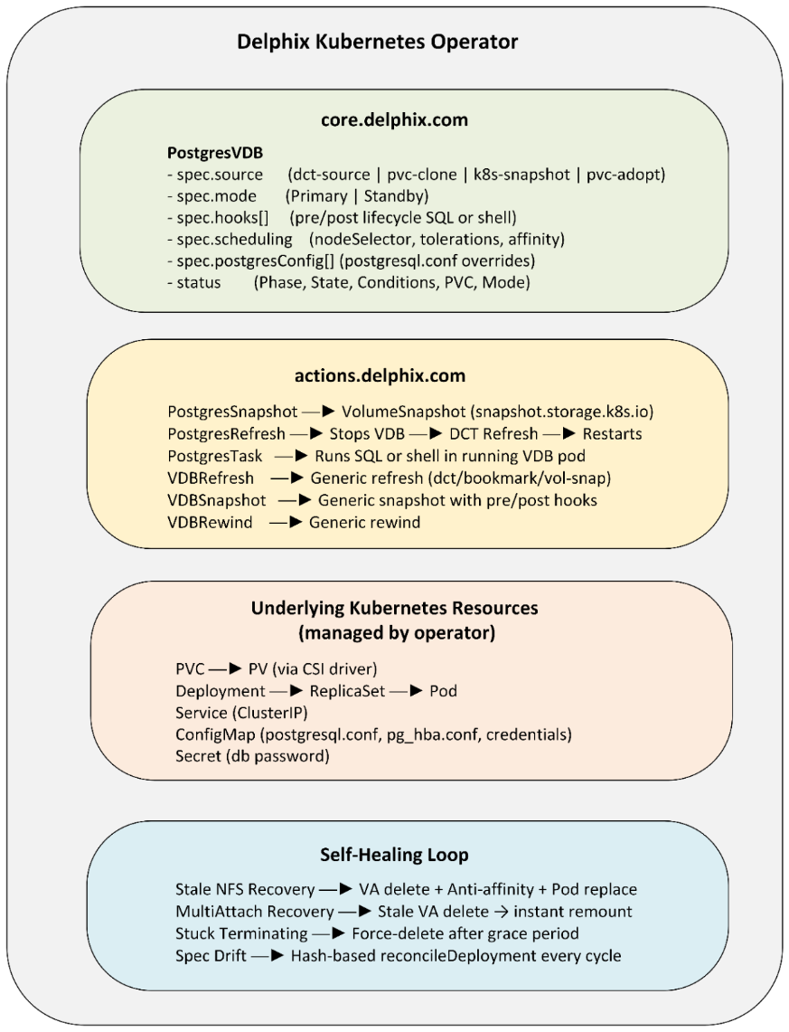 The Delphix K8s Operator is a cloud-native Kubernetes Operator that brings Delphix database virtualization fully into the Kubernetes control plane. Rather than manually crafting PVC manifests and container deployments, you declare the desired state of a virtual database using Kubernetes Custom Resources (CRDs). The operator's controllers continuously reconcile the desired state against the actual state, orchestrating DCT, the CSI driver, and the PostgreSQL pod lifecycle automatically.