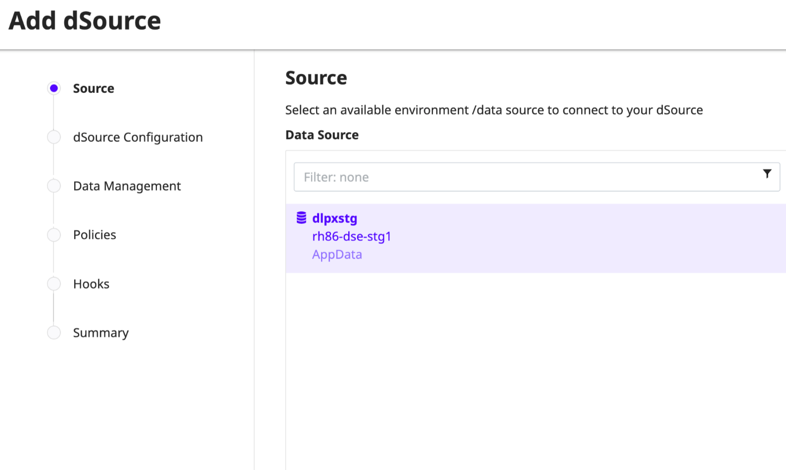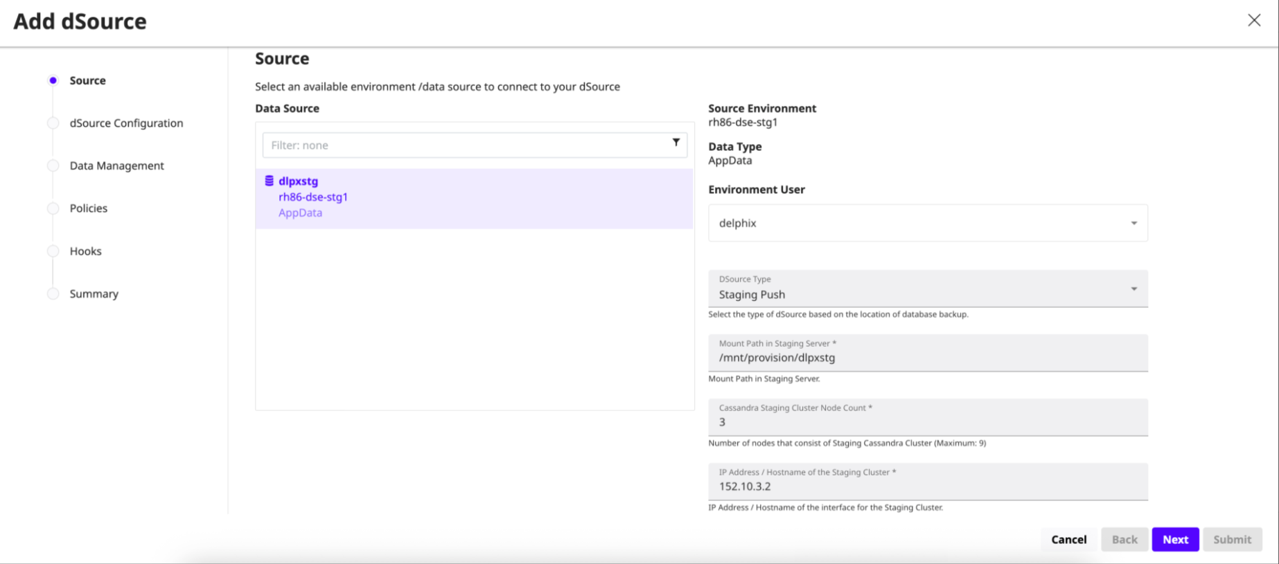 In the Add dSource wizard, select the Cassandra source config you just created on the staging host.