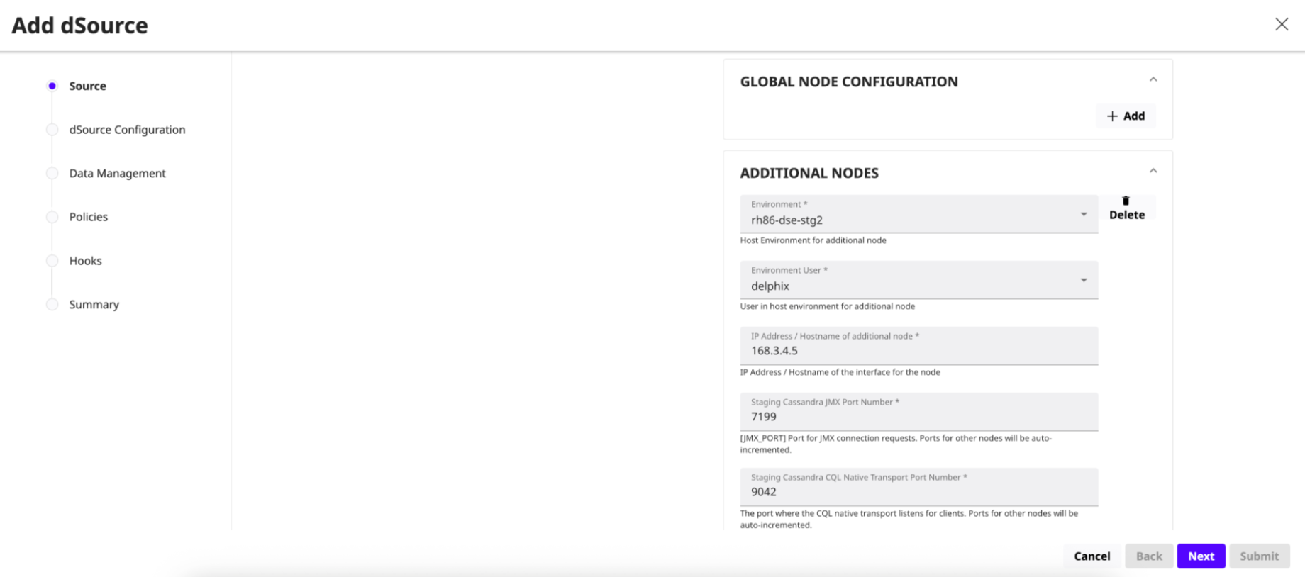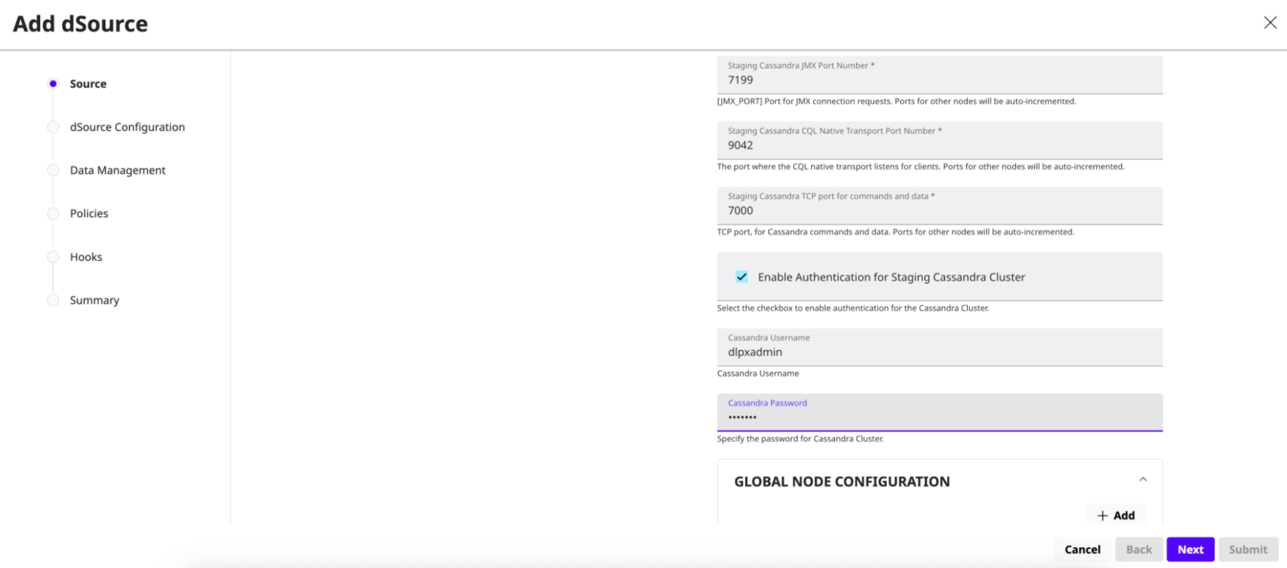 Global Node Configuration Specify the global node configuration for the Cassandra Staging Cluster.