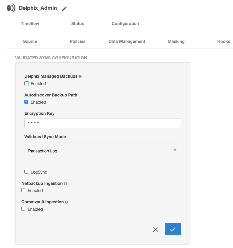 Toggling Delphix Managed Backups is supported for SQL Server dSources. This means a dSource that was previously created with Delphix Managed Backups Enabled can have regular validated sync and similarly a dSource that had external backups can use Delphix Managed Backups.