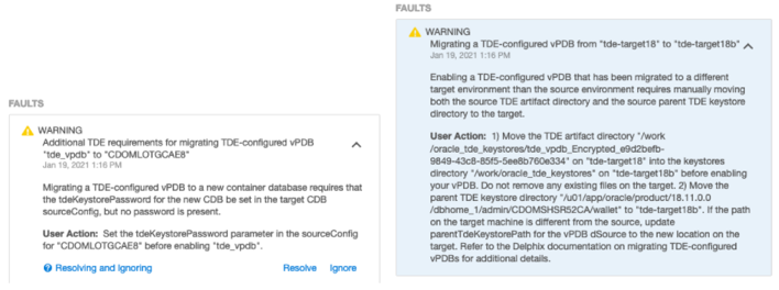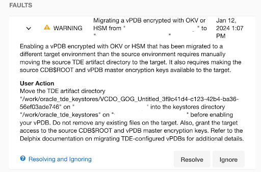 Below is an example of a fault generated during migration with the details for additional steps required to enable the vPDB on a new target environment.