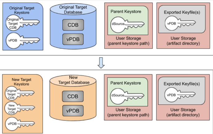 parentPdbTdeKeystorePath) needs to be updated.Merge the original CDB target keystore into the new target CDB’s keystore. This is required to support a rewind operation to a snapshot taken before the migrate.
