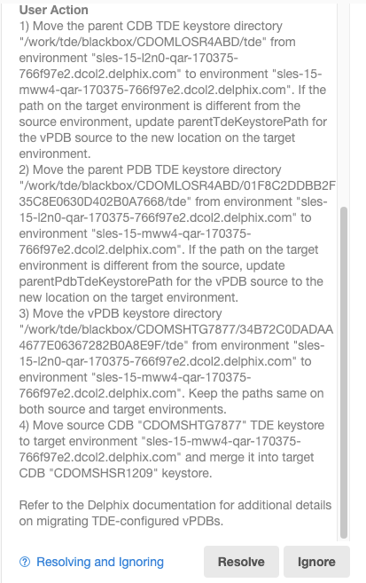 - (Applicable only for software keystore based vPDB in isolated mode) If a software keystore based vPDB in isolate mode has been migrated to a new target host, then there are additional steps that are required before the enable. The steps are necessary because the keystores are not present on Delphix Continuous Data storage. These steps are: