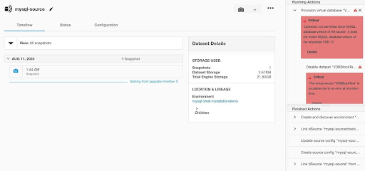 In version 4.1.0 of the MySQL connector, we have introduced guardrails to minimize accidentally broken VDBs when refreshing from a lower versioned dSource. A sample screenshot can be seen below.
