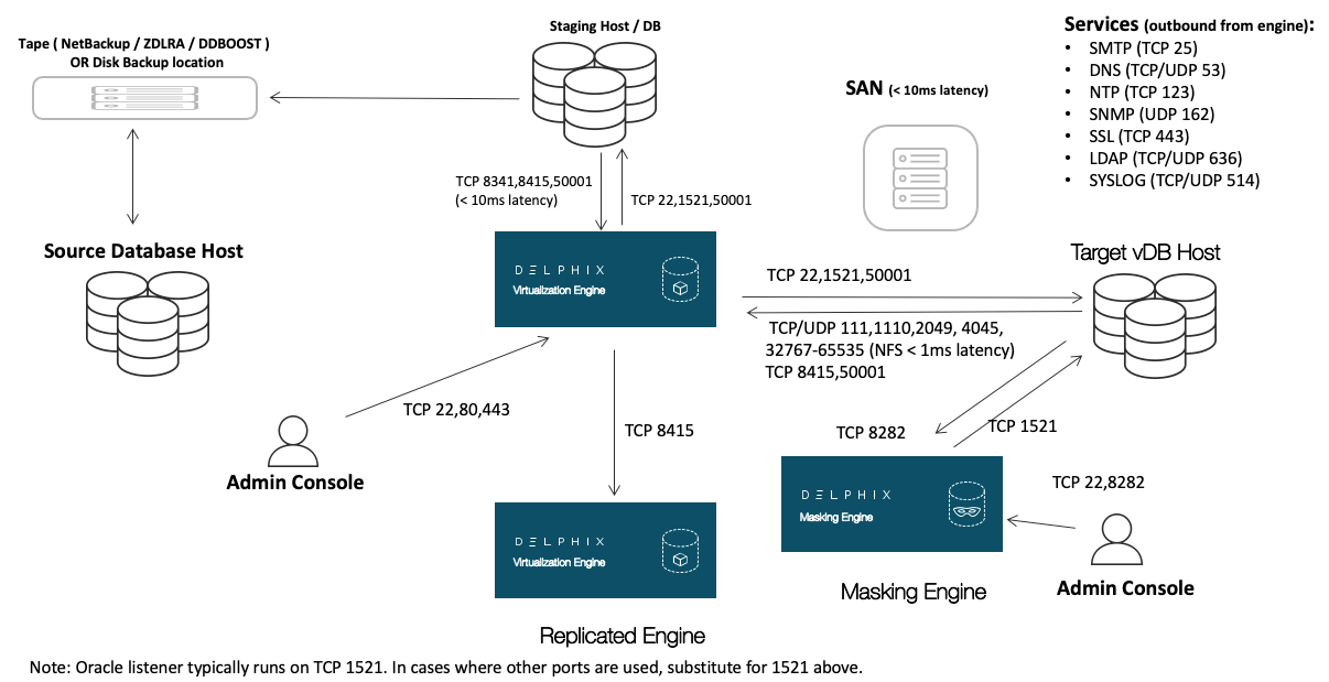 The following diagram describes the port allocations for Oracle environments. It illustrates the ports that we recommend to be open from Delphix to remote services, to the Delphix Engine, and to the Target Environments.