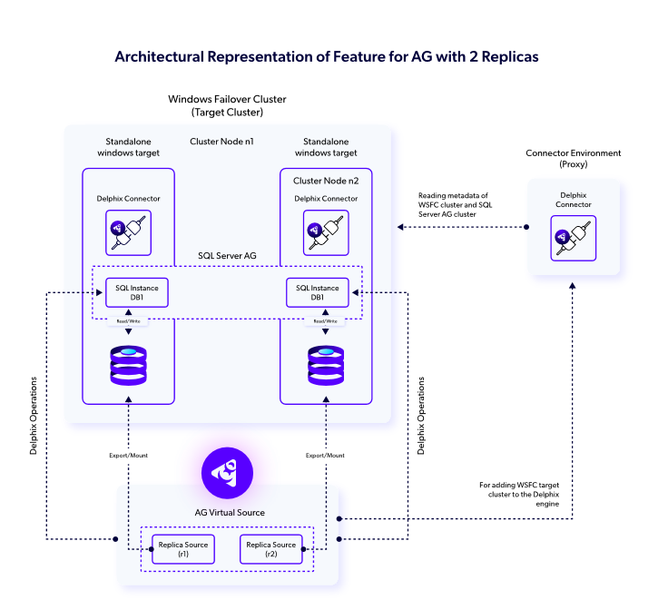 The Delphix AG virtual database container is similar to an availability database on SQL Server. An AG virtual database container is a logical entity that comprises of multiple replica database containers. Replica database containers represent the actual SQL Server databases that are hosted on Delphix storage mounted on every AG replica host.