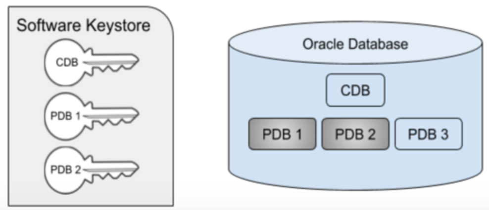 In the diagram below, PDBs 1 and 2 are encrypted, but PDB 3 is not. Note that the keystore contains all of the keys for the entire multitenant database, in this case, keys for the CDB, PDB 1, and PDB 2.