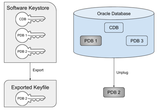 In order to unplug a TDE-enabled PDB, the key(s) for that PDB must be exported from the keystore into a new file, known as an exported keyfile. Oracle will prevent the PDB from being unplugged unless the keys have first been exported. The exported keyfile is encrypted with a password (known as the keyfile secret) that is specified during the export. The diagram below illustrates the scenario where PDB 2 has been unplugged. Note that the key for PDB 2 still remains in the keystore. This illustrates an important point about Oracle keystores - once added, a key cannot be easily removed from a keystore.