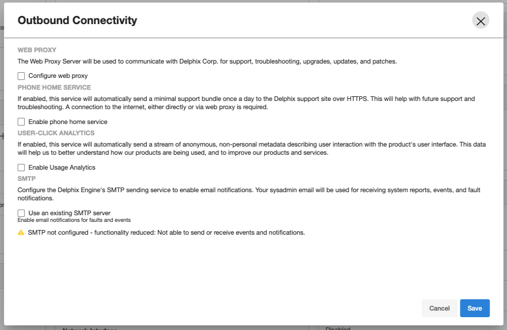 The Delphix User-click Analytics feature is a lightweight method to capture how users interact with Delphix product user interfaces. The goal of capturing this data is to get a better understanding of product usage, engagement, and user behavior, and to use this data to improve Delphix products and customer experience. This feature is enabled by default for customers deploying on or upgrading to this version. User-click Analytics may also be disabled via the UI.