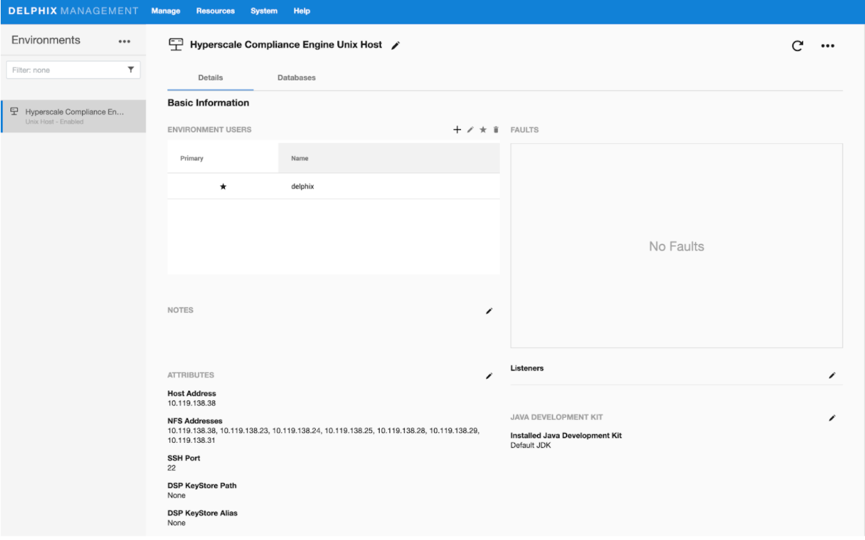 After the discovery is completed, configure the same Unix host on the Environments screen such that the IP addresses of the Hyperscale Compliance Orchestrator Unix host (or IP address for nodes of Kubernetes cluster, for a Kubernetes deployment) along with the Continuous Compliance Engines part of the Continuous Compliance Engine cluster are populated in the NFS Addresses field. This is done to ensure that the empty VDB is shared with both Hyperscale Compliance Orchestrator and the Continuous Compliance Engines part of the Continuous Compliance Engine cluster.